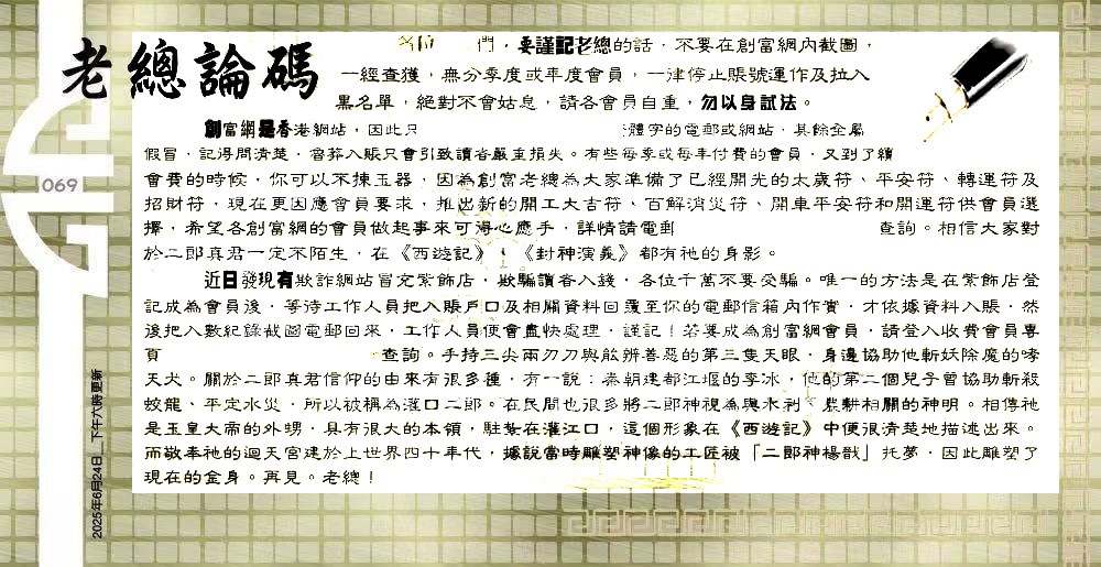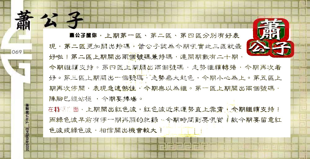 主题 :069期:六合皇金句/老总论码/萧公子/林大师/五行夺码/老总信箱截 |