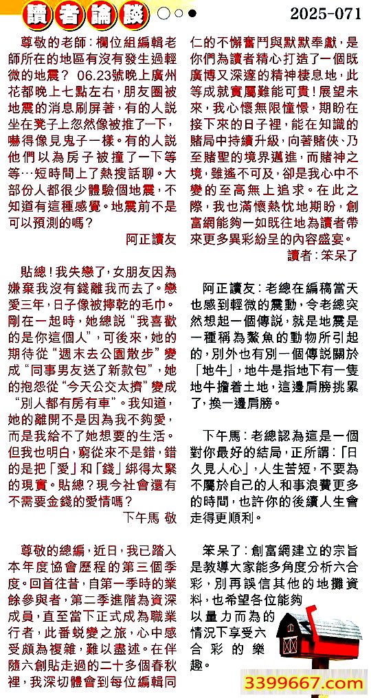 主题 :071期:彩民推荐〖貼信讀者論壇〗 |