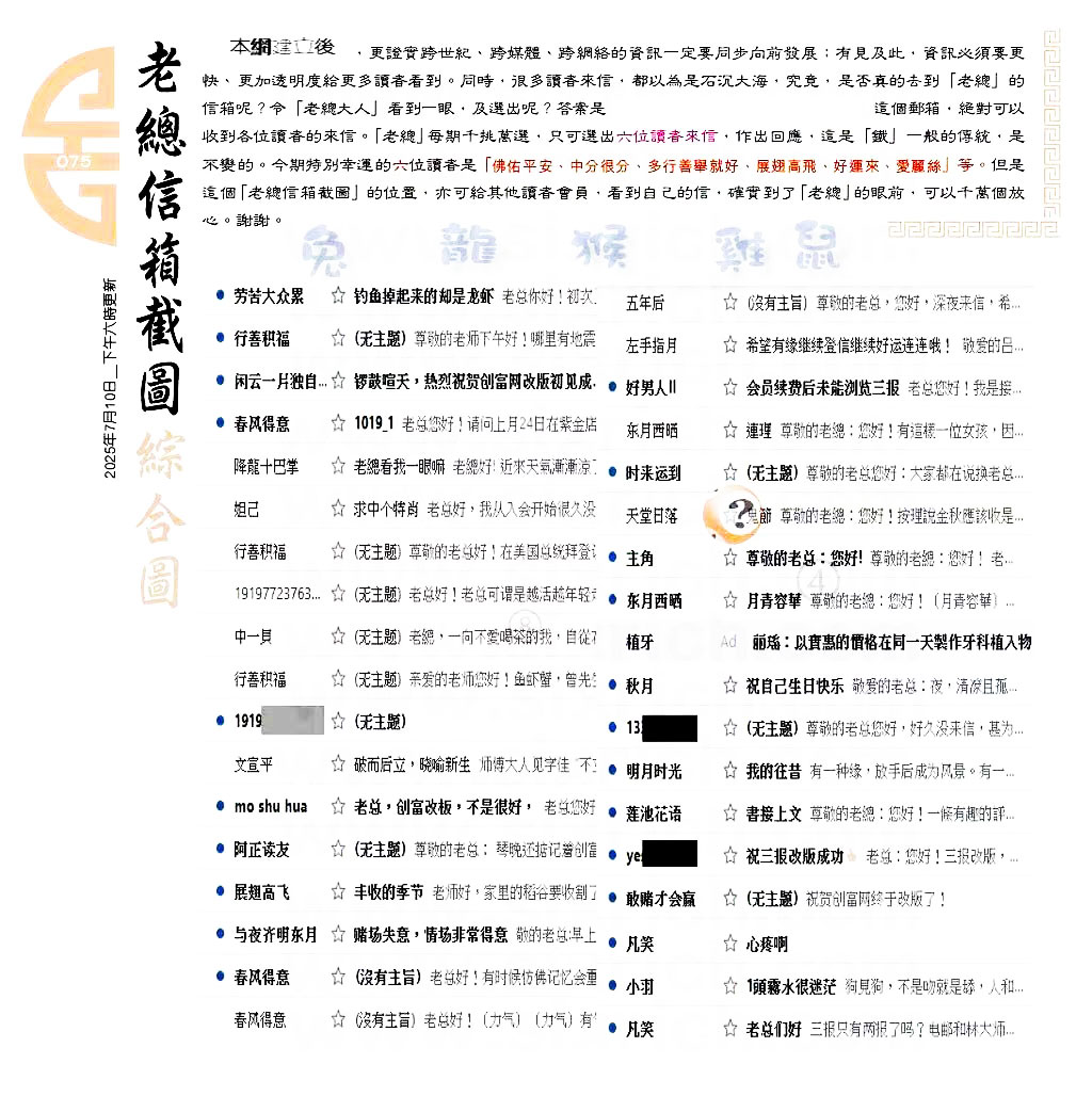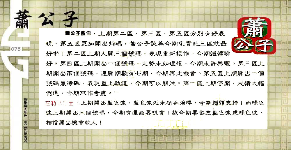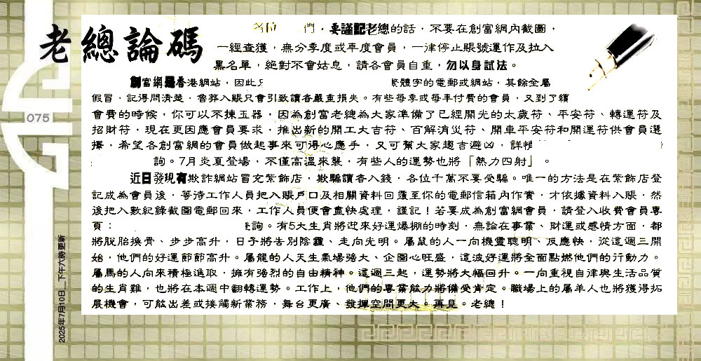 主题 :075期:六合皇金句/老总论码/萧公子/林大师/五行夺码/老总信箱截 |