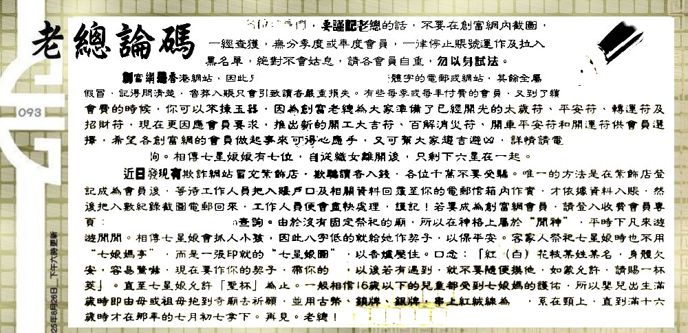 主题 :093期:六合皇金句/老总论码/萧公子/林大师/五行夺码/老总信箱截 |