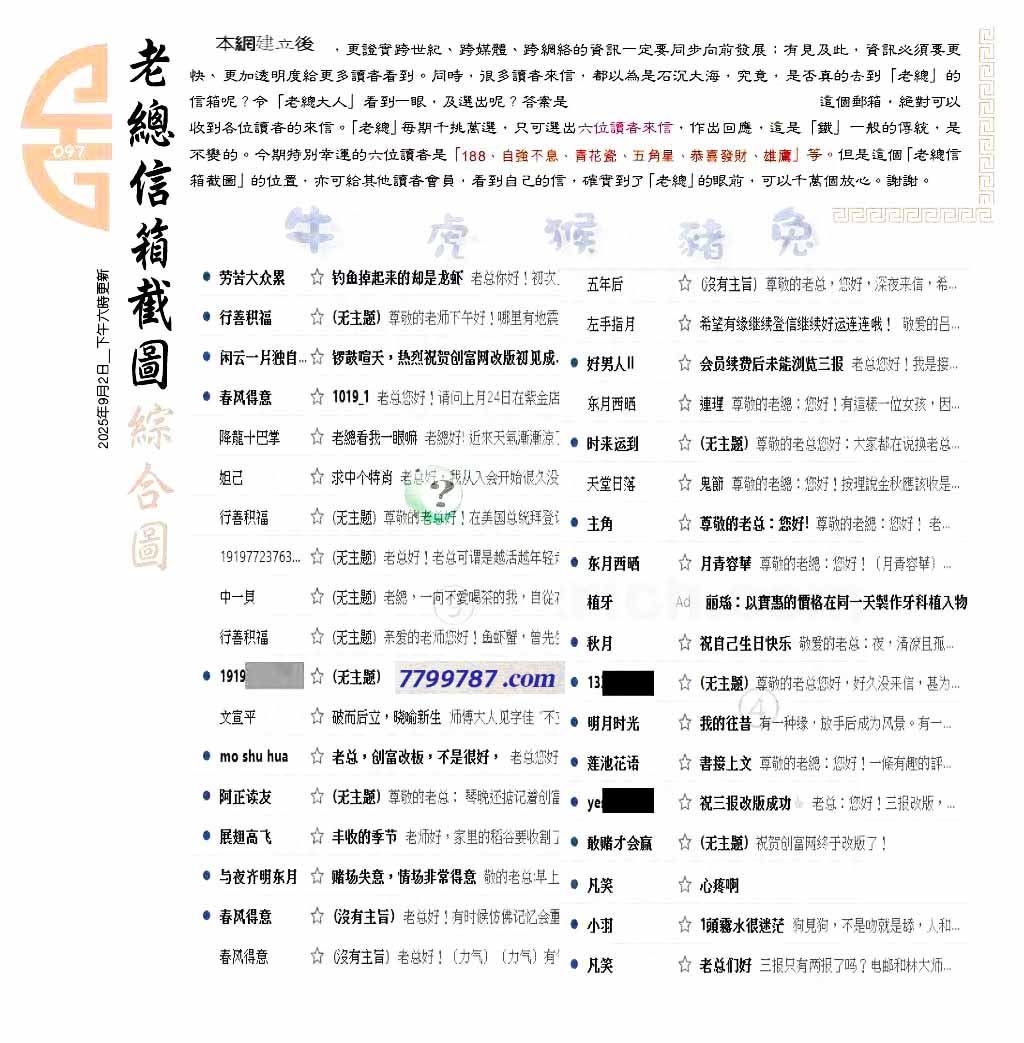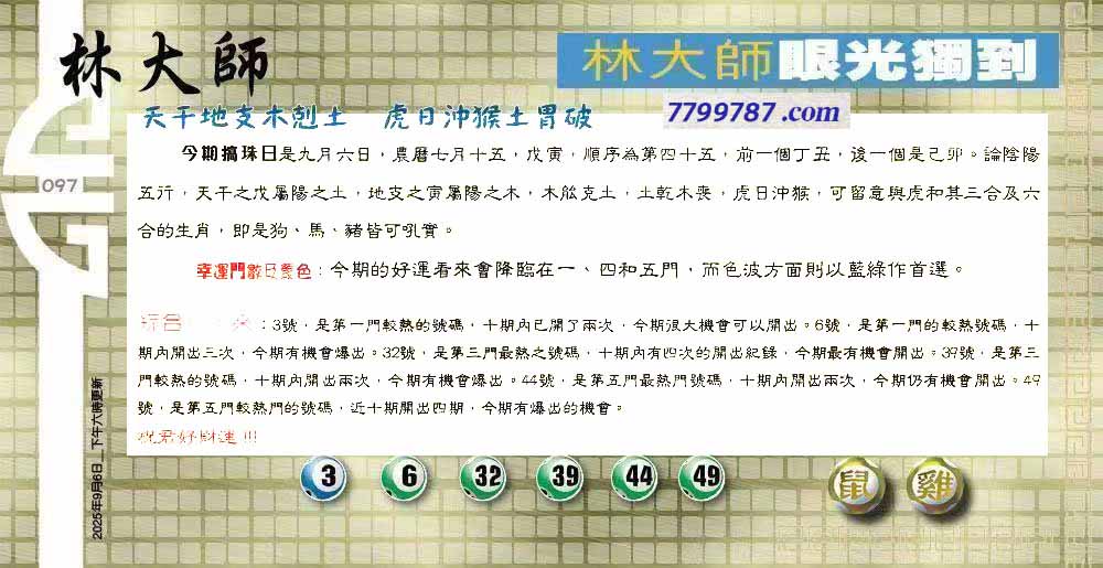 主题 :097期:六合皇金句/老总论码/萧公子/林大师/五行夺码/老总信箱截 |