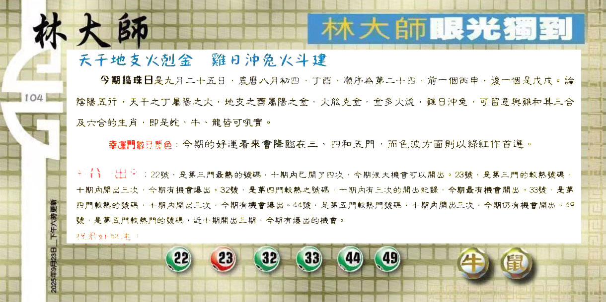主题 :104期:六合皇金句/老总论码/萧公子/林大师/五行夺码/老总信箱截 |