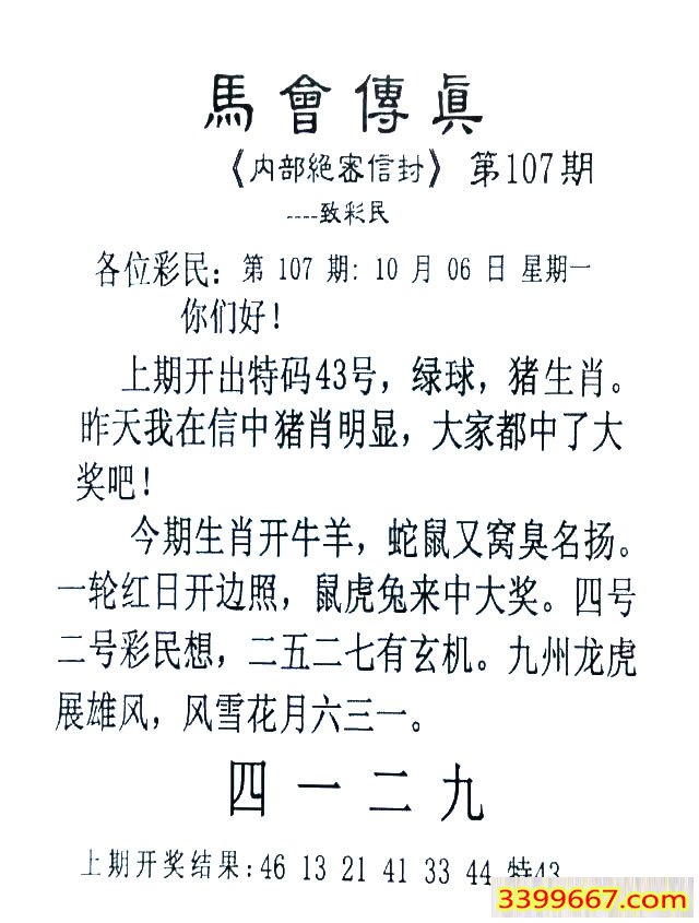 107期:首发推荐:≮馬會傳眞≯→(香港正版)